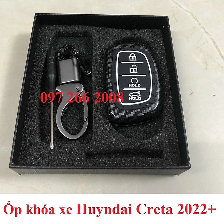 Ốp chìa khóa carbon xe Hyundai Creta, I10 2021 2022 2023 - chìa 4 nút,tặng kèm móc khoa cao cấp