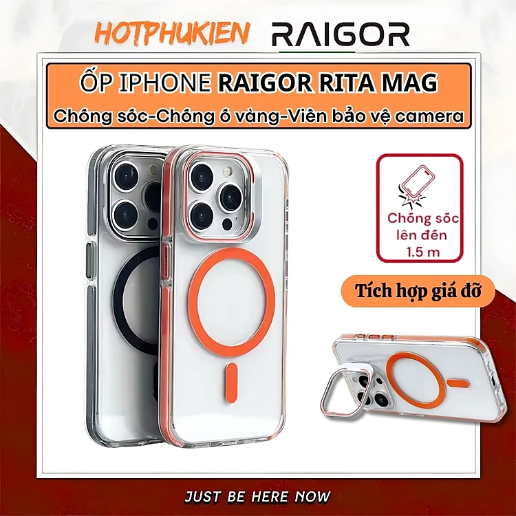 Ốp lưng chống sốc cho iPhone 16 Pro Max iP 15 Pro Max sạc không dây từ tính viền bảo vệ camera kiêm giá đỡ trong suốt hiệu Raigor Rita - Hàng nhập khẩu