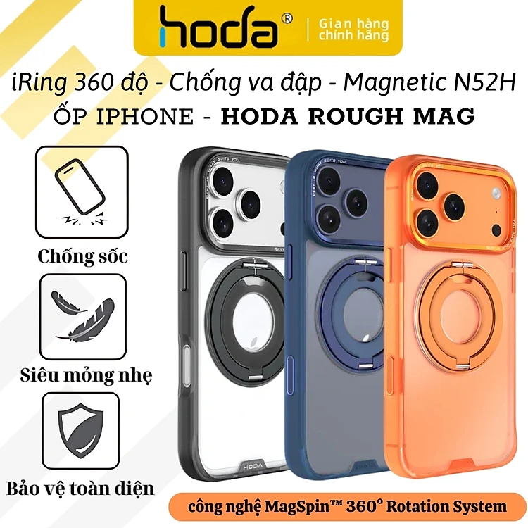 Ốp lưng chống sốc chuẩn MIL-STD-810H từ tính MagSpin 360° Rotation Hoda Rough iRing cho iPhone 17 16 Pro Max tích hợp giá đỡ Magnetic, Chống Sốc Quân Đội, giá đỡ Đứng Tích Hợp - Hàng nhập khẩu