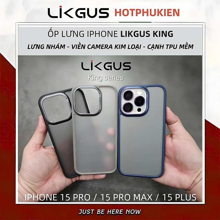 Ốp lưng chống sốc lưng nhám chống vân tay cho iPhone 15 Pro Max iP 15 Pro 15 Plus hiệu Likgus KING - viền camera kim loại, cạnh cao su chống sốc, chống mồ hôi tay - Hàng nhập khẩu