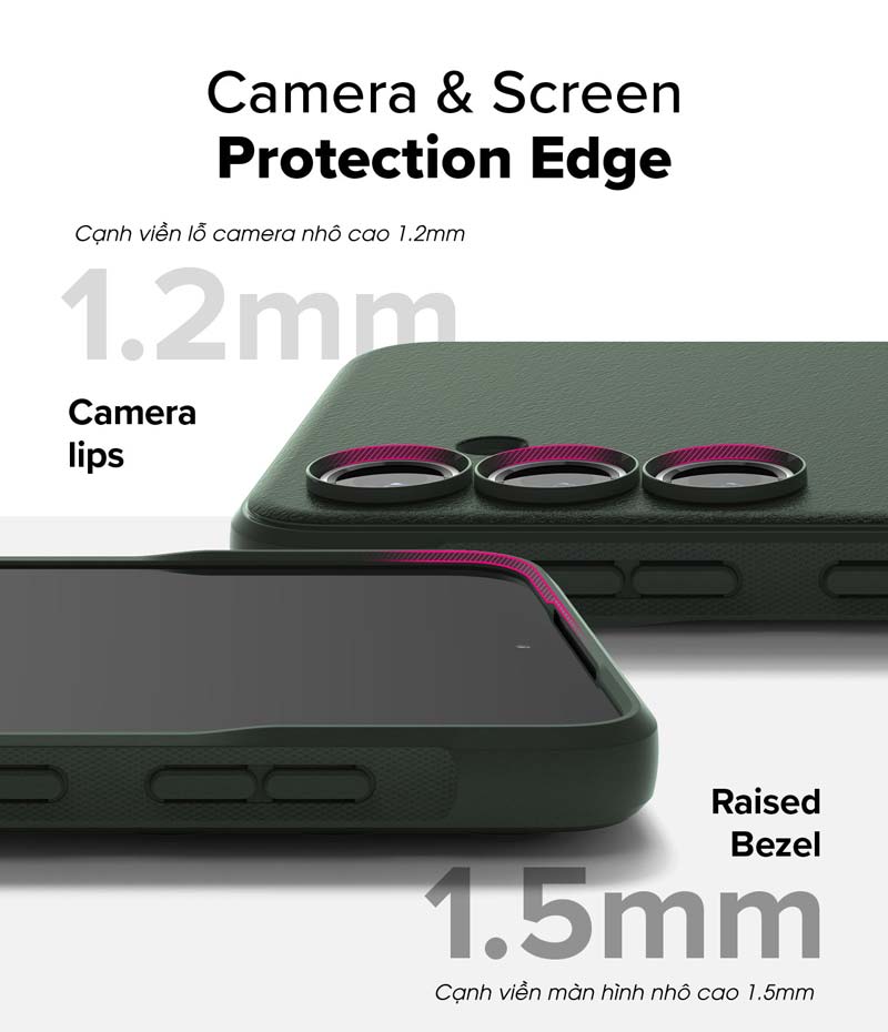 - Thiết kế cạnh viền lỗ camera nhô cao 1.2 mm và thiết kế cạnh viền màn hình nhô cao 1.5 mm giúp chống trầy.