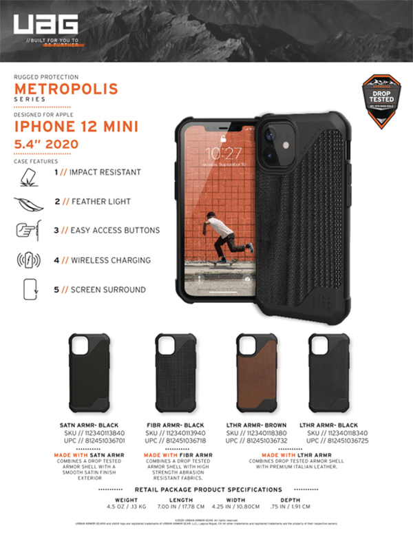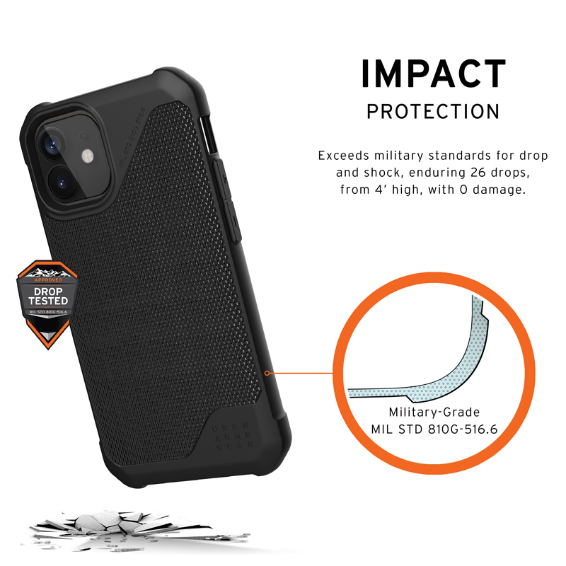 Ốp lưng iPhone 12 Mini UAG Metropolis LT Series đạt chuẩn MIL-STD 810G 516.6 của Quân đội Mỹ. Đây là bài kiểm tra giả lập về bảo vệ thiết bị khi để điện thoại/máy tính bảng vào ốp lưng và rơi ngẫu nhiên từ độ cao 1.2m. Số lần rơi là 26 lần mà thiết bị vẫn an toàn.