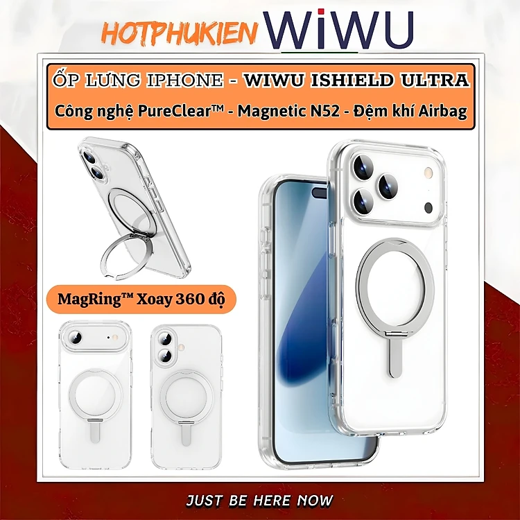 Ốp lưng sạc từ tính trong suốt PureClear tích hợp chân đế giá đỡ MagRing FlexStand WIWU iShield Ultra cho iPhone 17 Pro Max Air - Chống Sốc 3X Military, Vòng Đỡ Xoay 360°, Chống Sốc Quân Đội, Chống Ố Vàng - Hàng nhập khẩu