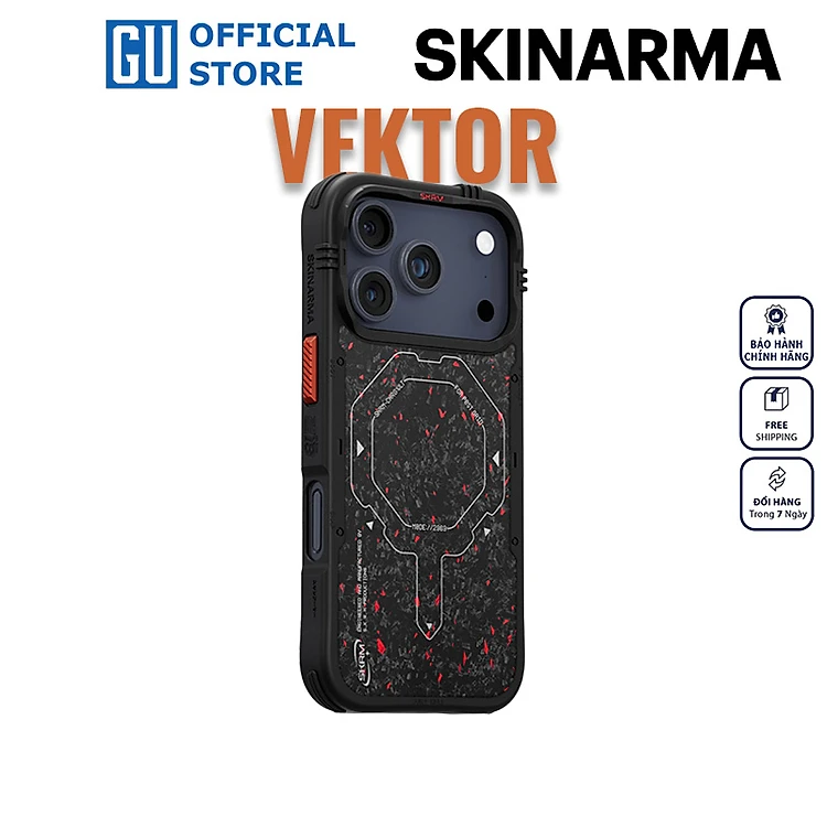 Ốp Lưng SKINARMA VEKTOR Cho iPhone 17 Pro/ 17 Pro Max Mặt Lưng Sợi Carbon Điểm Xuyết Hạt Đỏ Sạc Không Dây Mag-Charge Hàng Chính Hãng