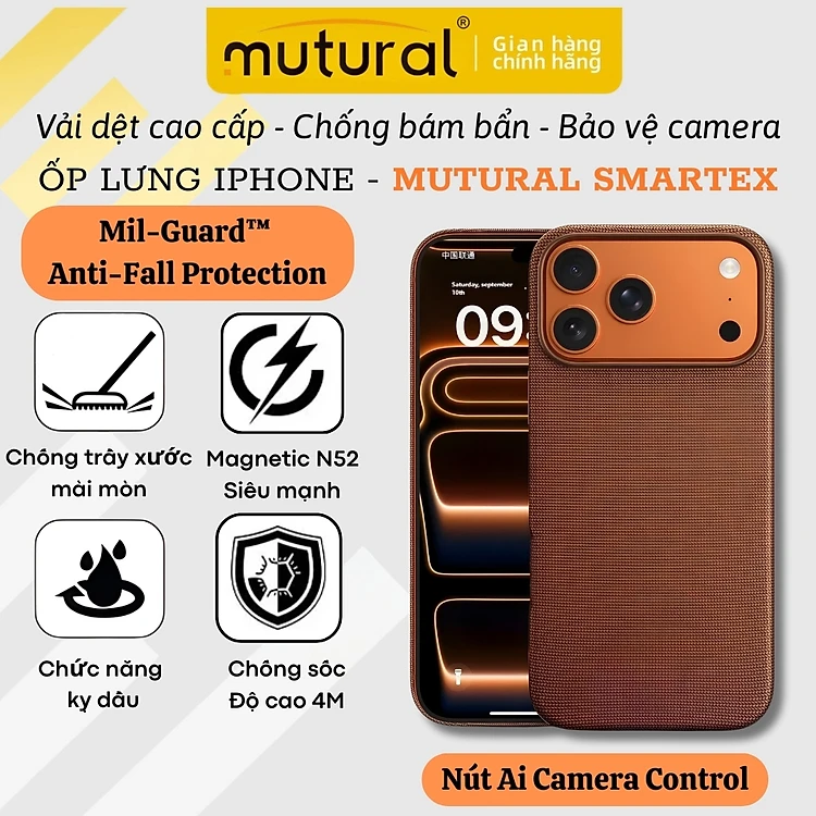 Ốp Lưng từ tính MUTURAL SMARTEX Mil-Guard Anti-Fall cho iPhone 17 Pro Max - Vải Dệt Cao Cấp, Nút Kim Loại | Hỗ Trợ Gắn Dây Đeo, Chống rơi & chống sốc chuẩn quân đội - Hàng nhập khẩu