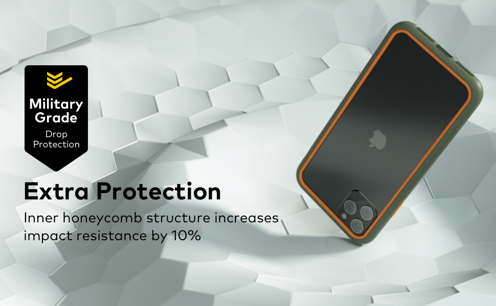***RhinoShield đã phát minh ra một vật liệu mới có tên là Polymer Bảo vệ tuỳ biến, tính linh hoạt và hấp thụ những cú rơi lên tới 90%, được thiết kế giống như tổ ong (honey Comb)