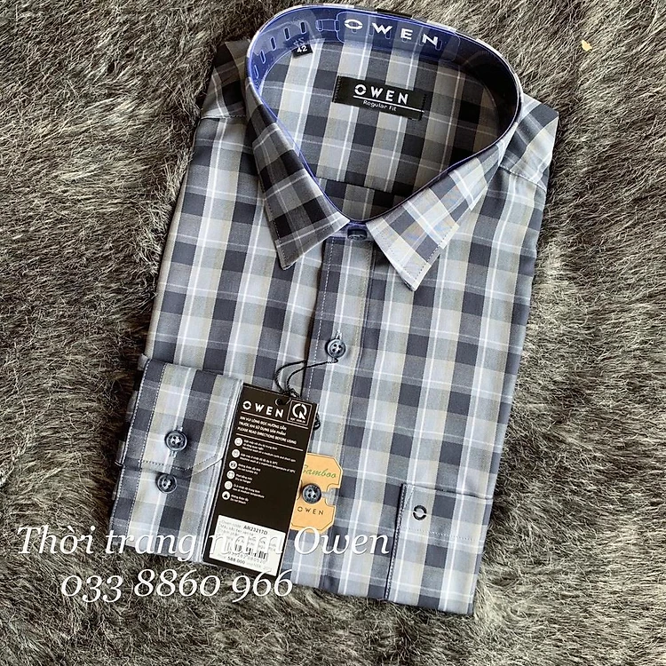 OWEN - Áo sơ mi dài tay Owen Regular fit chất sợi tre kẻ ca rô đen xám 23217