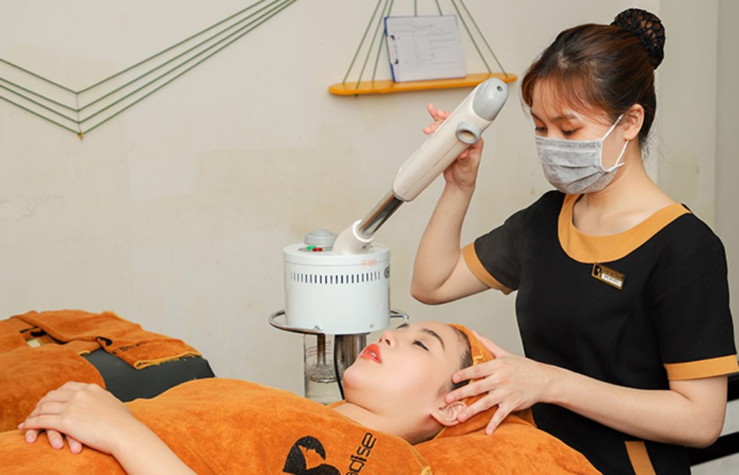 Bước 2: Xông hơi mặt kết hợp thanh tẩy da chết.