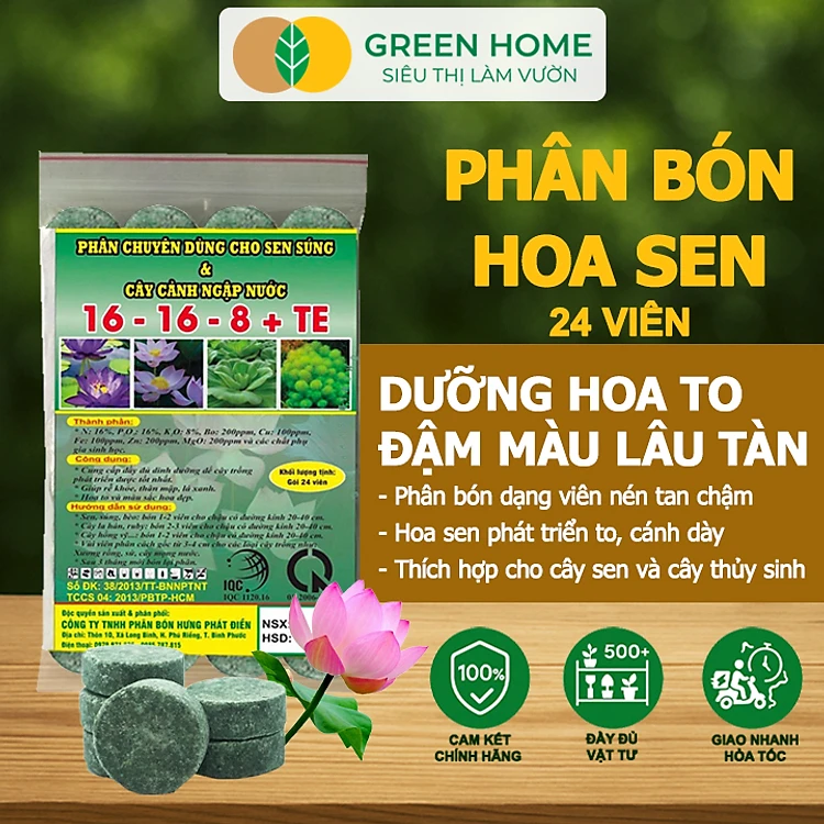 Phân Bón Hoa Sen Greenhome, Vỉ 24 Viên, Cây Thuỷ Sinh, Ngập Nước, Cho Hoa To, Hoa Đậm Màu, Lâu Tàn, Tốt Lá