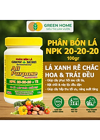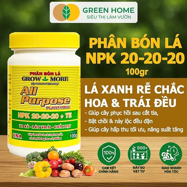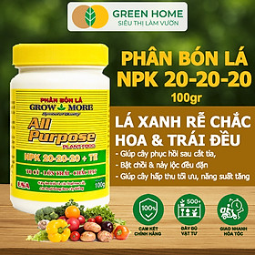 Phân Bón Lá Grow More NPK 20-20-20, GreenHome, Chai 100GR, To Củ, Lớn Trái, Chắc Hạt