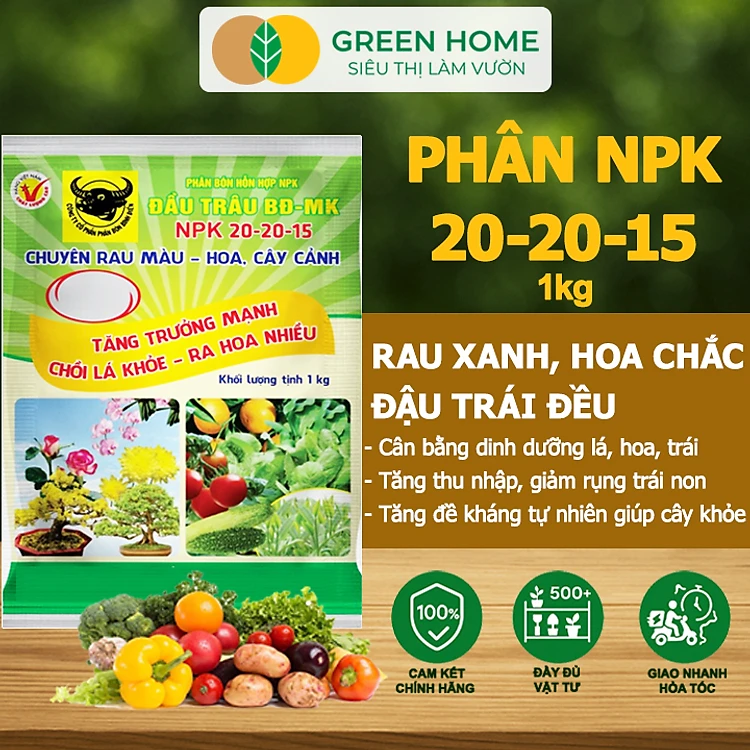 Phân Bón NPK 20-20-15, Greenhome, Đầu Trâu, 1Kg, Chuyên Hoa, Cây Cảnh Giúp Ra Hoa, Hoa Đẹp, Lâu Tàn