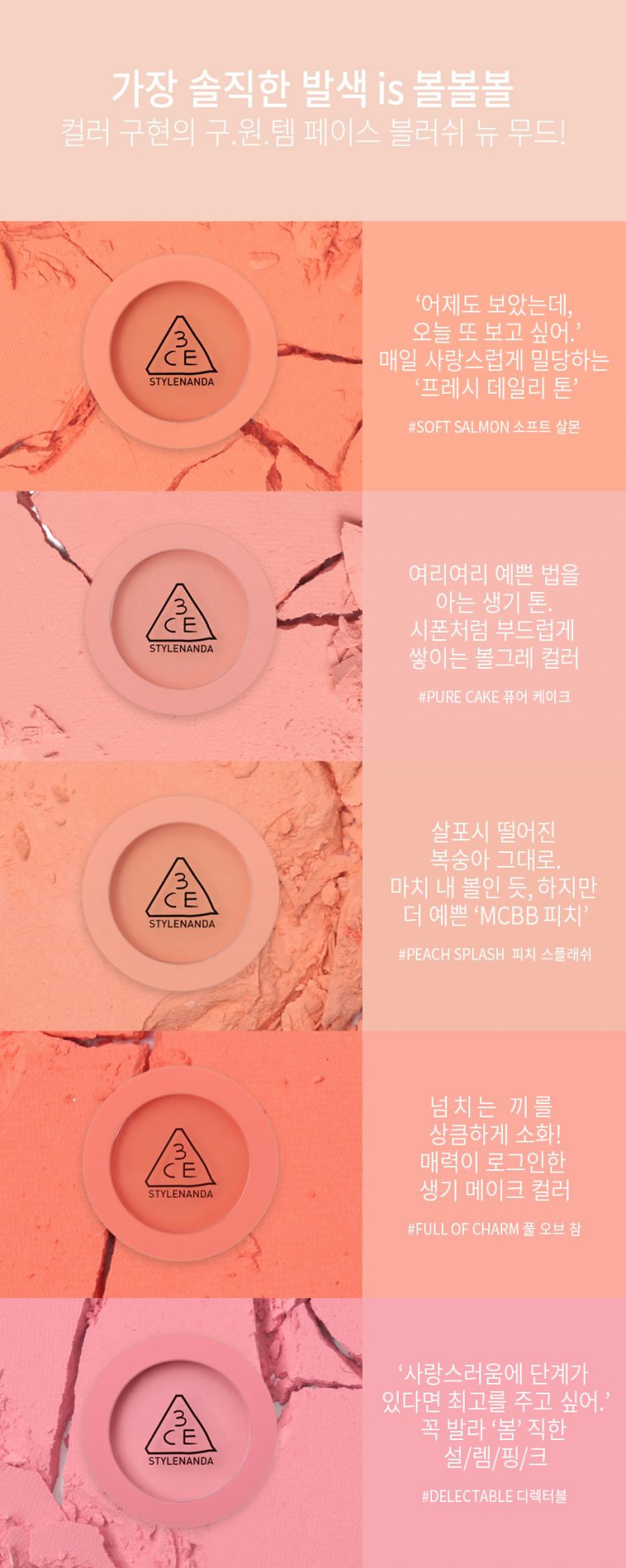 Bộ 5 màu má Face Blush trong 3CE Mood For Blossom Edition có chất phấn siêu mềm mịn hoàn hảo, bám da cực tốt nhưng không hề gây cảm giác nặng nề cho da, không gây bít lỗ chân lông. Khả năng bám màu tốt, lên đến suốt cả ngày, cho bạn gái lớp makeup tươi sáng rạng rỡ tự nhiên nhất có thể.