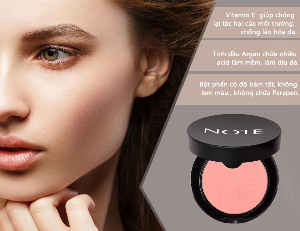 Phấn má hồng không lem màu trang điểm và lâu trôi parapen free cùng hoạt chất dưỡng da tươi sáng Note Luminous Silk Compact Blusher - Thổ Nhĩ Kỳ 5.5g với thành phần có chứa tinh dầu argan giúp da láng mượt, mềm mại, hạn chế tối đa tình trang da khô, mốc, che khuyết điểm cho làn da rạng rỡ. Kết cấu hạt phấn mỏng mịn, bám đều lên da, giữ phấn lâu, không bị trôi, bay khi sử dụng. Công thức đặc biệt của Note Luminous Silk Compact Powder giúp kiềm dầu trong thời gian dài, giúp da luôn thoáng sạch và mềm mịn.