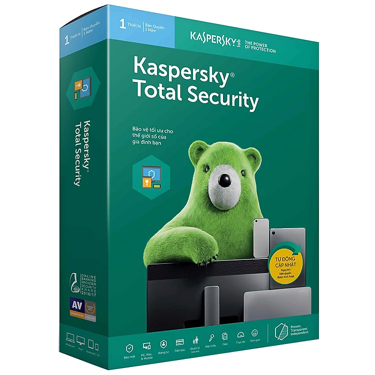 Kaspersky Total Security (KTS) bảo vệ tốt cho máy tính Windows, Mac, Android. Điện thoại máy tính bảng khi bị mất hoặc đánh cắp bạn sẽ dễ dàng khóa thiết bị, xóa dữ liệu và xác định vị trí.