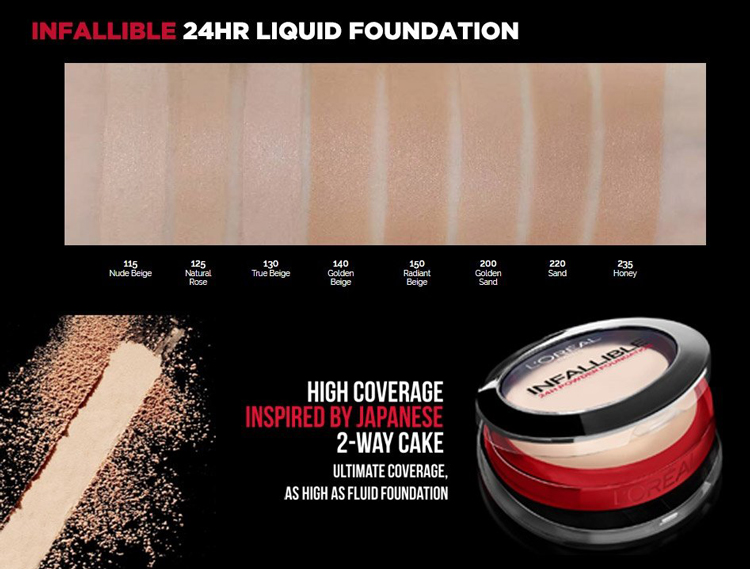 - Phấn Nền L'Oreal Infallible Compact 24H sở hữu thành phần an toàn, thân thiện với làn da có khả năng tạo lớp nền mịn và sáng, che phủ mọi khuyết điểm trên khuôn mặt, cho lớp trang điểm nền đẹp rạng rỡ tự nhiên.