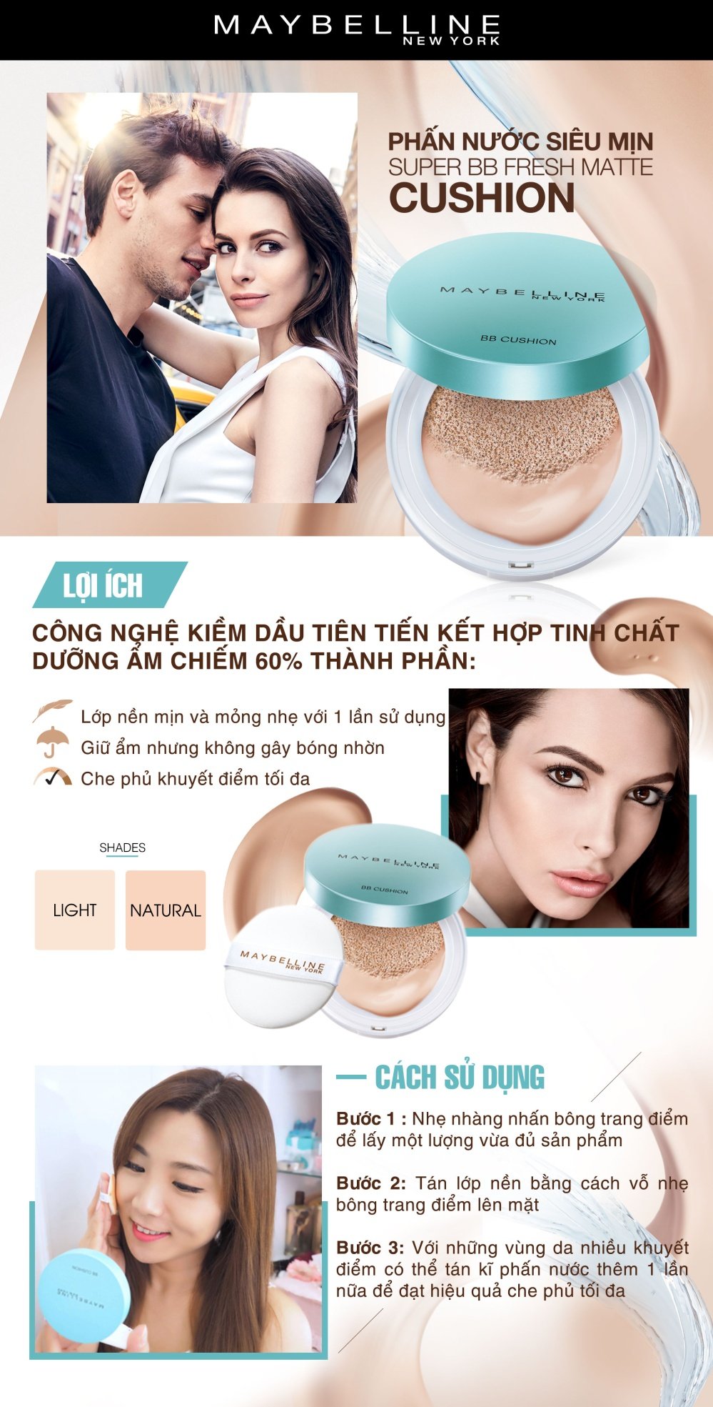 - Phấn Nước Kiềm Dầu Maybelline Cushion Natural (14g) cho bạn lớp nền mịn đẹp hoàn hảo với một cái vỗ nhẹ. Phấn giữ ẩm nhưng không gây bóng nhờn, che phủ khuyết điểm tối đa.