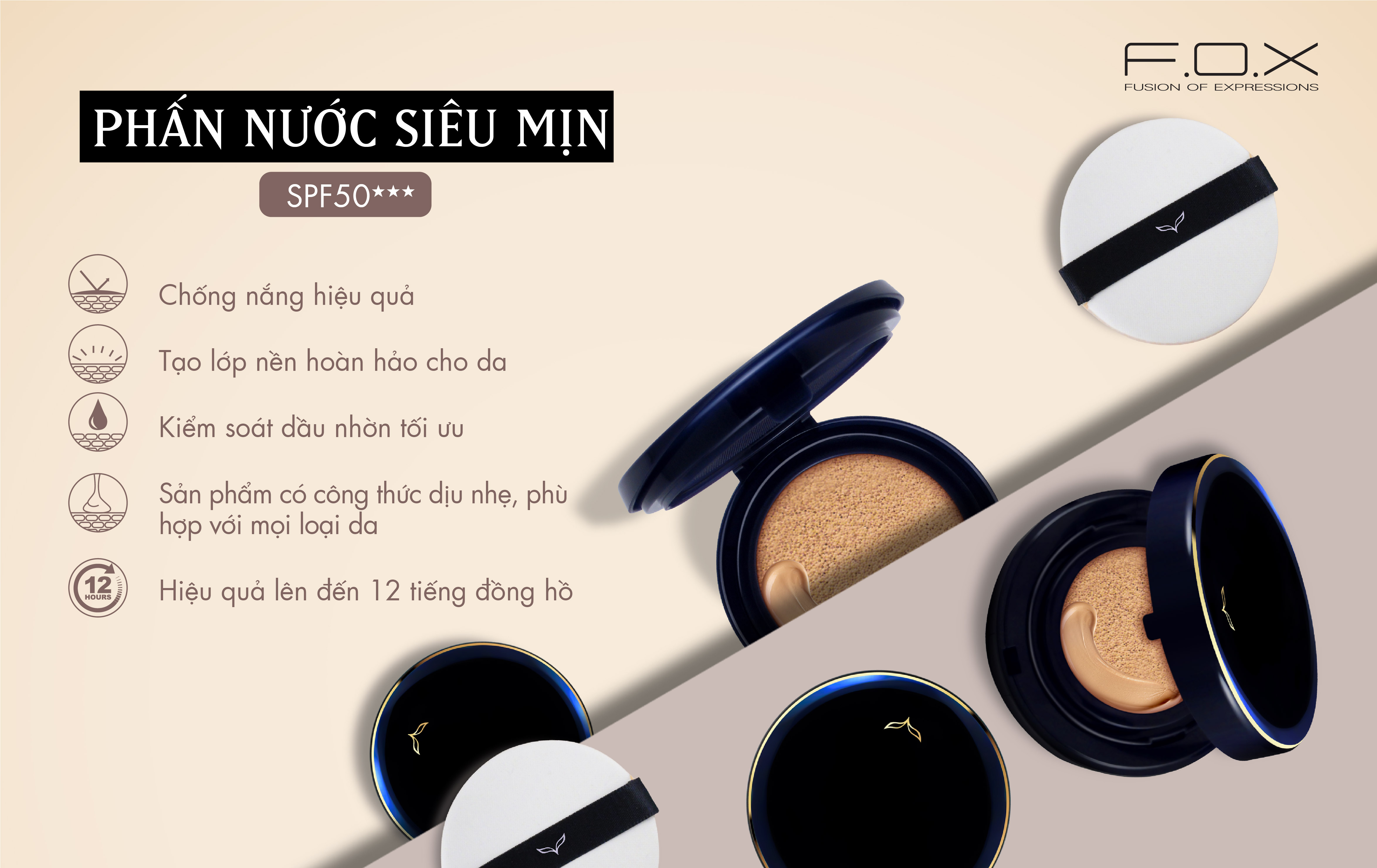 Phấn Nước Siêu Mịn F.O.X - SPF50★★★ với công thức đặc biệt 5 trong 1: Trắng da, kiềm dầu, chống nắng hiệu quả, giữ ẩm cho da và tạo lớp nền hoàn hảo sẽ giúp bạn có được lớp trang điểm căng bóng, mỏng mịn và tự nhiên hơn.