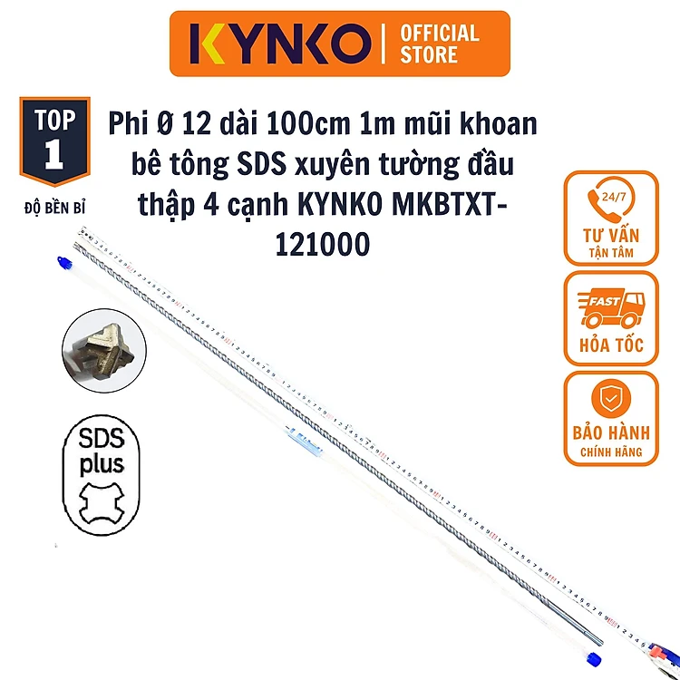 Phi Ø 12 dài 100cm 1m mũi khoan bê tông SDS xuyên tường đầu thập 4 cạnh KYNKO MKBTXT-121000