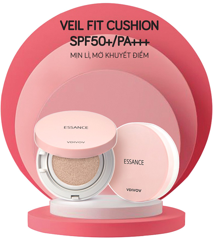 - Essance Veil Fit Cushion có độ che phủ cao, tạo hiệu ứng lì nhưng kết cấu vẫn mỏng nhẹ, giúp lớp nền luôn mịn màng tự nhiên trong thời gian dài.