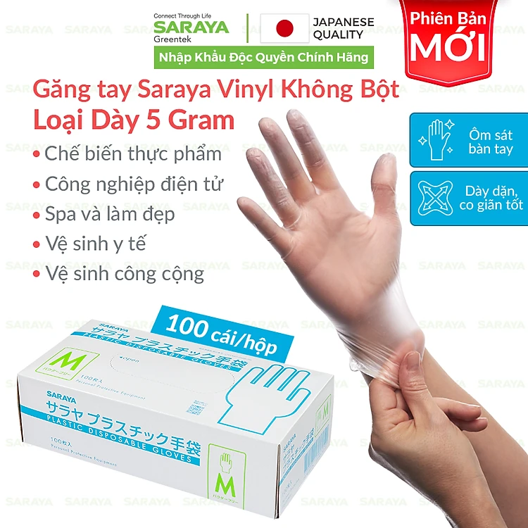 [PhiênBảnMới] Găng tay Saraya Vinyl Không Bột trong suốt loại dày 5gram, dùng chế biến thực phẩm, vệ sinh - 100 cái/hộp
