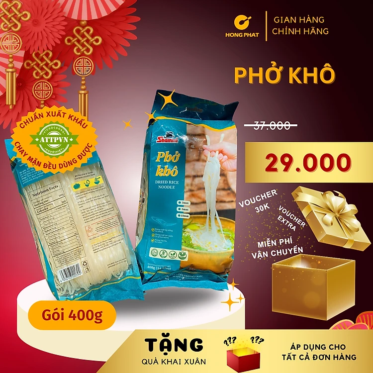 Sợi phở dai dai, bùi bùi, màu trắng chuẩn vị sợi phở Việt Nam được làm từ 100% nguyên liệu tự nhiên chất lượng, đảm bảo an toàn. Phở khô Shammi gói 400g giúp bạn bảo quản được lâu. Phở khô có thể dùng để chế biến đa dạng các món ăn như xào hoặc nấu với nước lèo tùy thích một cách đơn giản.