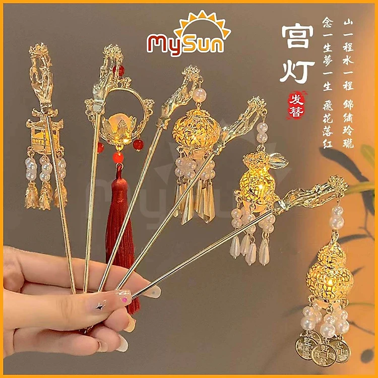 Châm Trâm cổ trang cài tóc kim loại cho cô dâu màu đỏ Trung Hoa quốc đơn giản đẹp có đèn MySun