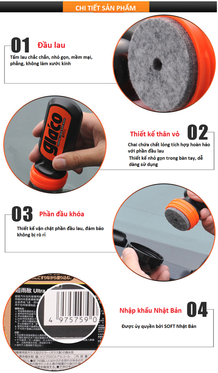 (*) Ultra Glaco phủ nano kính xe hơi siêu bền bỉ. Lớp phủ dày, cho tác dụng lên đến 1 năm sử dụng.