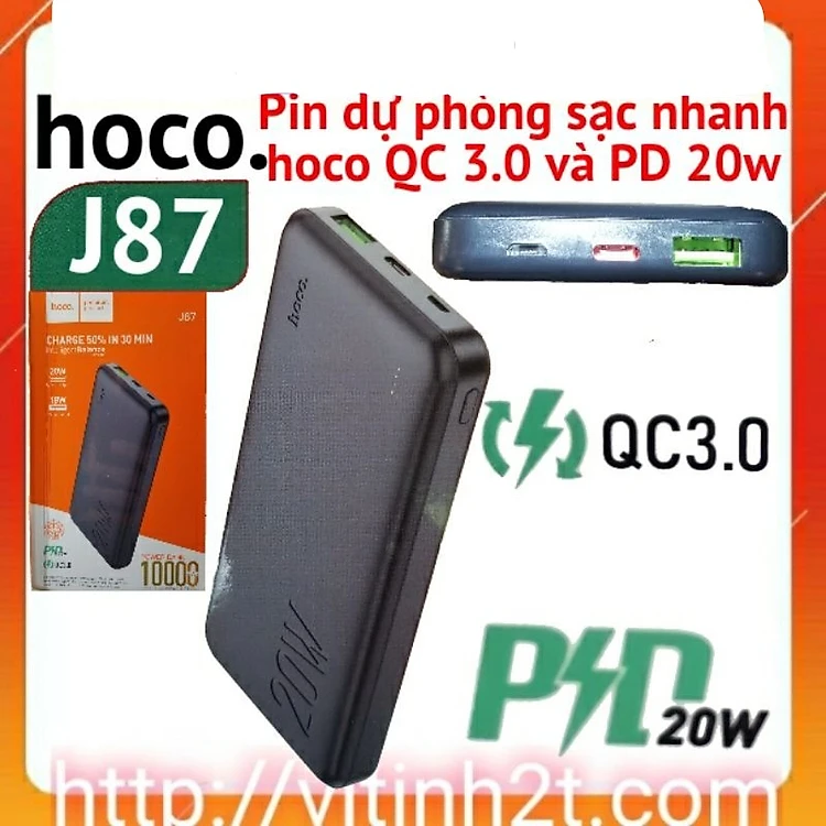 Pin dự phòng sạc nhanh 10.000mah hoco J87 QC 3.0 và PD 20w,cổng sạc type-c sạc đảo chiều(HÀNG CHÍNH HÃNG)
