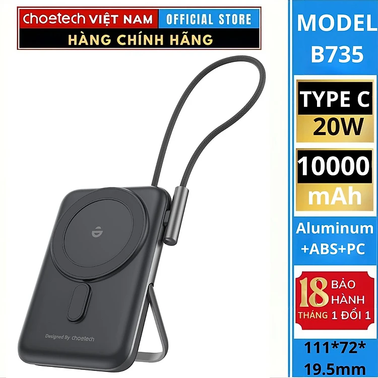 Pin sạc dự phòng Choetech B735 dây cáp sạc Type C công suất 20w dung lượng 10000mAh (Hàng chính hãng)