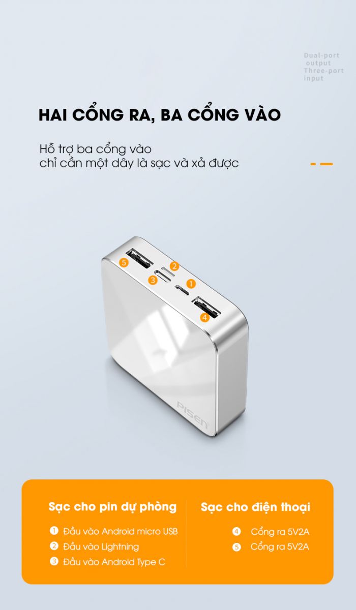 Thiết bị có 2 cổng ra 5V - 2A và hỗ trợ 3 cổng vào là Android micro USB, Lightning và Android Type C, bạn chỉ cần một dây là có thể sạc - xả được.