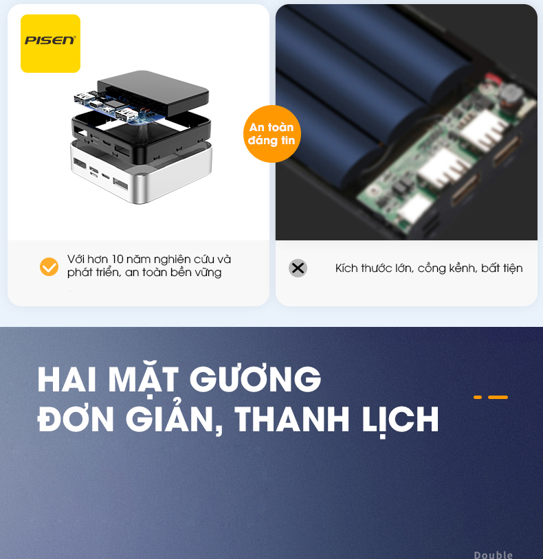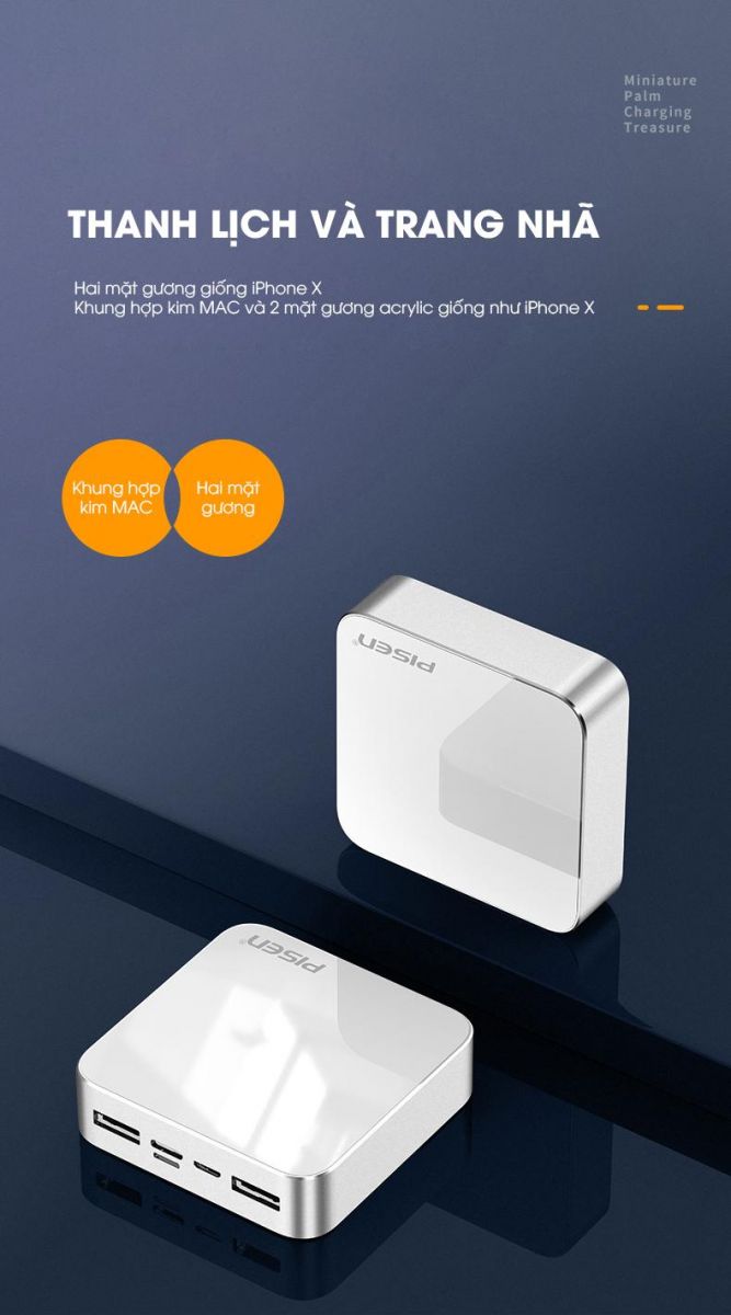 Pin Sạc Dự Phòng Mini Mirror Pisen 10000mAh (Hợp kim Mac + 2 Mặt Kính, 2x USB Smart, Led) - Hàng Chính Hãng được thiết kế 2 mặt gương đơn giản, thanh lịch. Công nghệ 2 mặt gương acrylic + khung hợp kim Mac, đầy tính thẩm mỹ