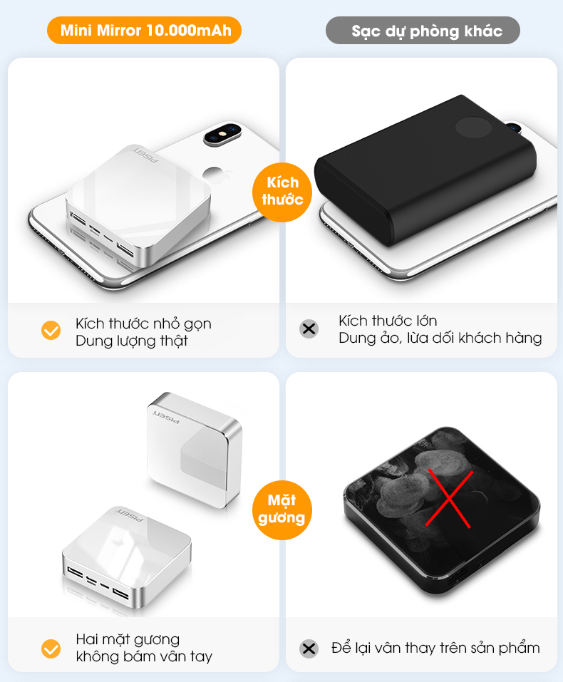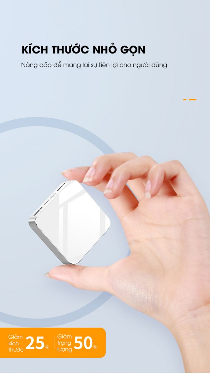 Thiết kế siêu nhỏ gọn cùng hai mặt gương đơn giản thanh lịch hạn chế vân tay giữ cho sản phẩm luôn bóng sáng và sang trọng. Dung lượng pin thật lên tới 10.000mAh sẽ luôn là sản phẩm đảm bảo nhu cầu sử dụng của bạn được đáp ứng.