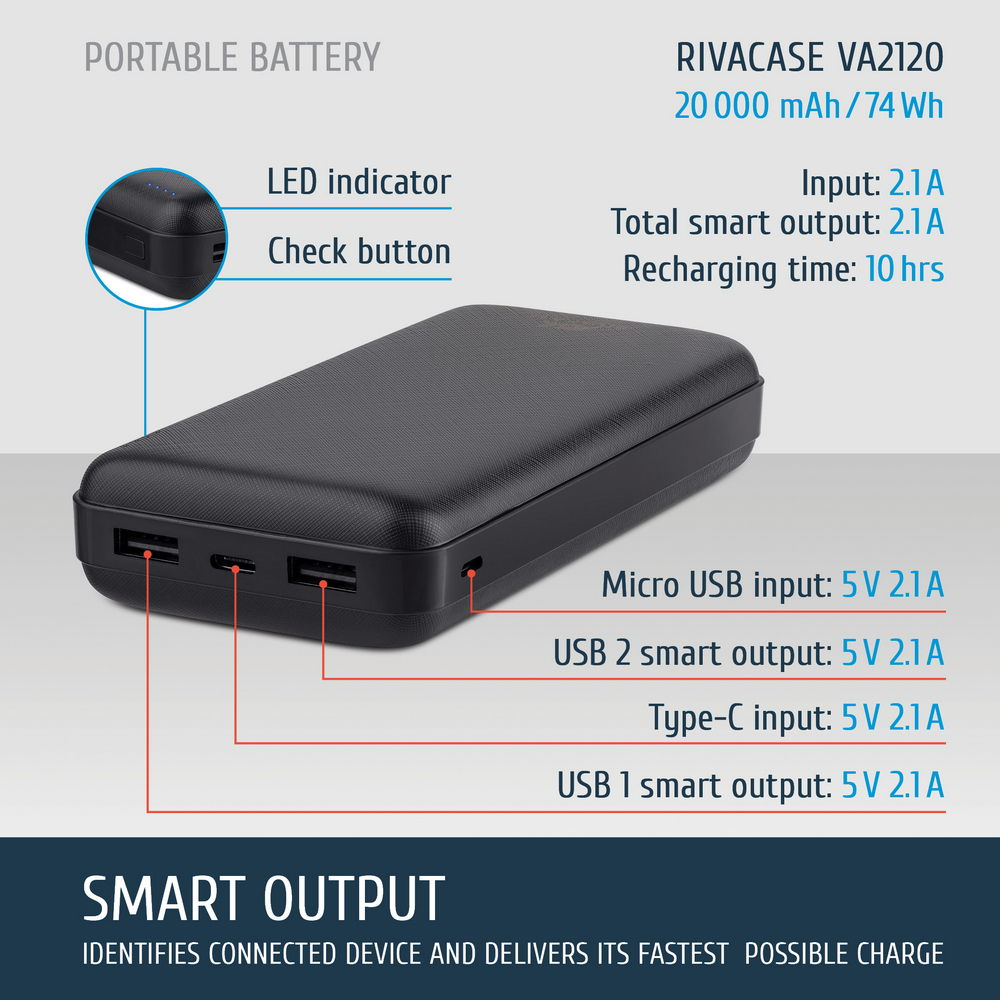 - Tự động bật/tắt. Chỉ cần cắm các thiết bị do động vào các ổ cắm đầu ra của pin RIVACASE VA2120 và quá trình sạc sẽ bắt đầu