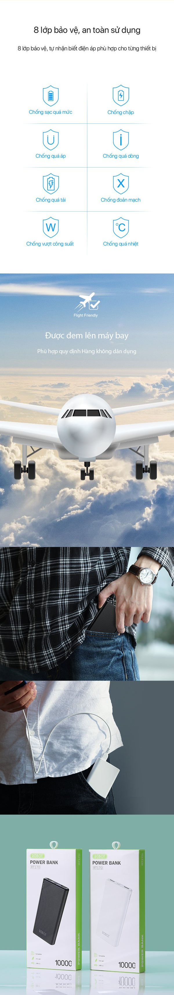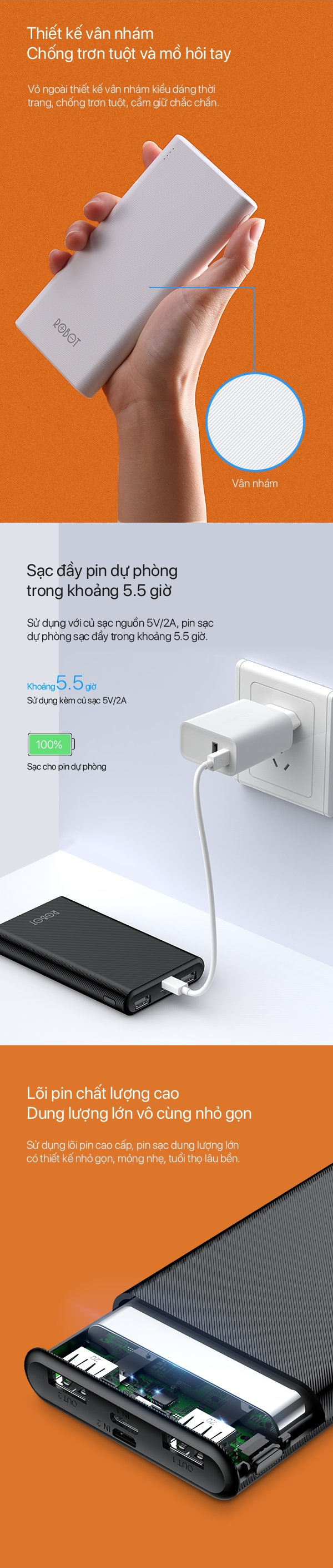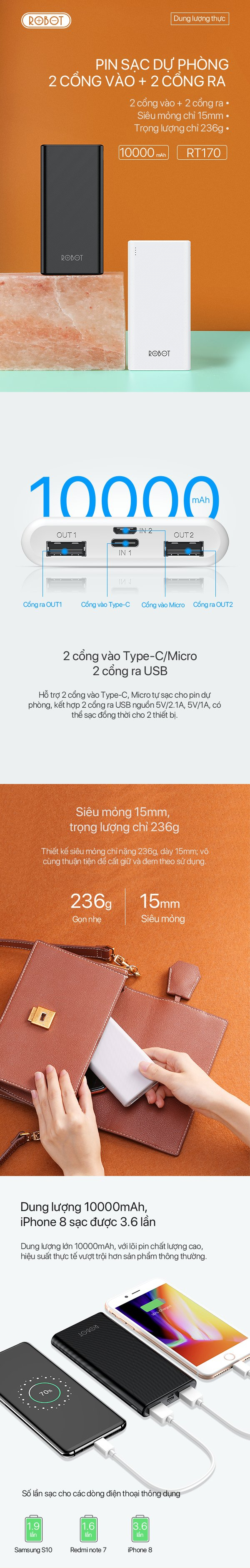 Pin Sạc Dự Phòng ROBOT RT170 10000mAh Thiết Kế Nhỏ Gọn 2 Cổng USB Và 2 Cổng Micro Type-C - Hàng Chính Hãng