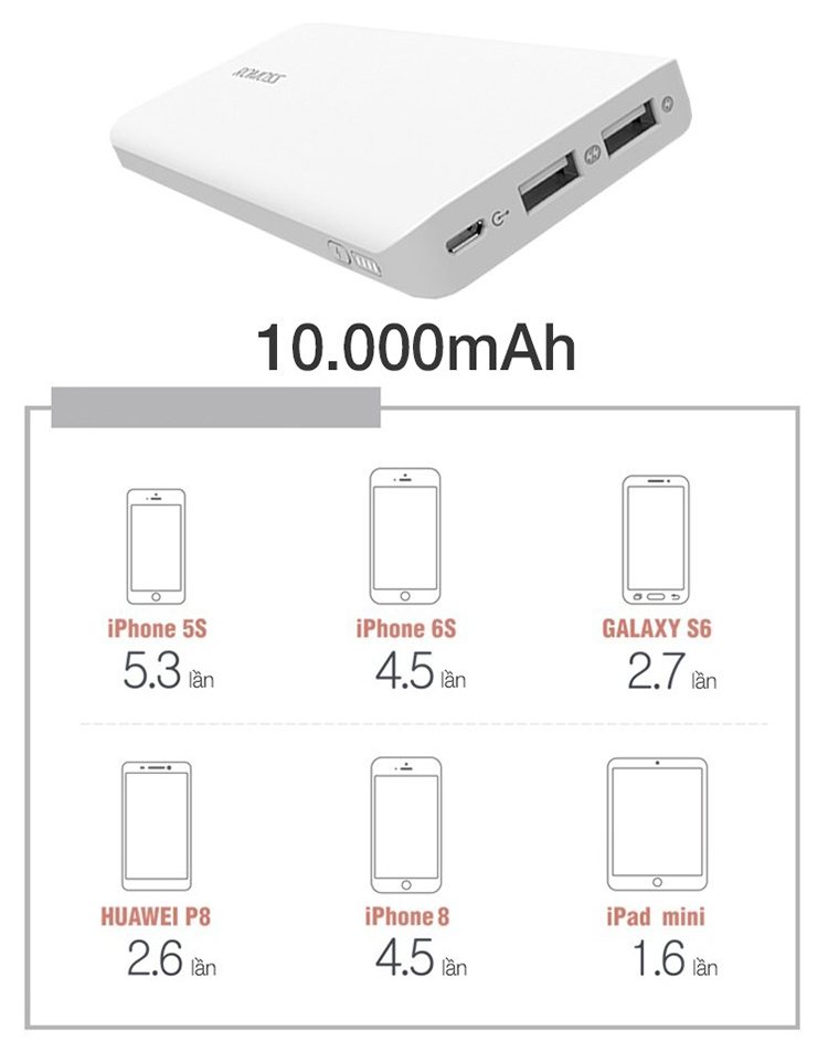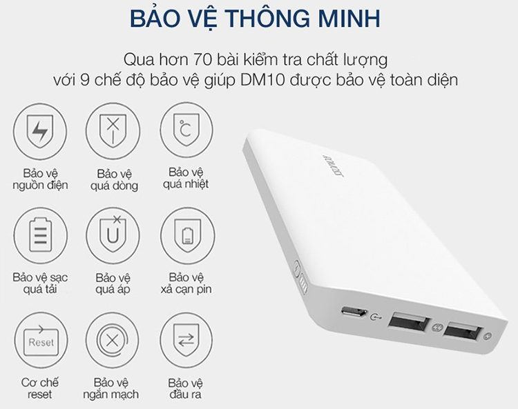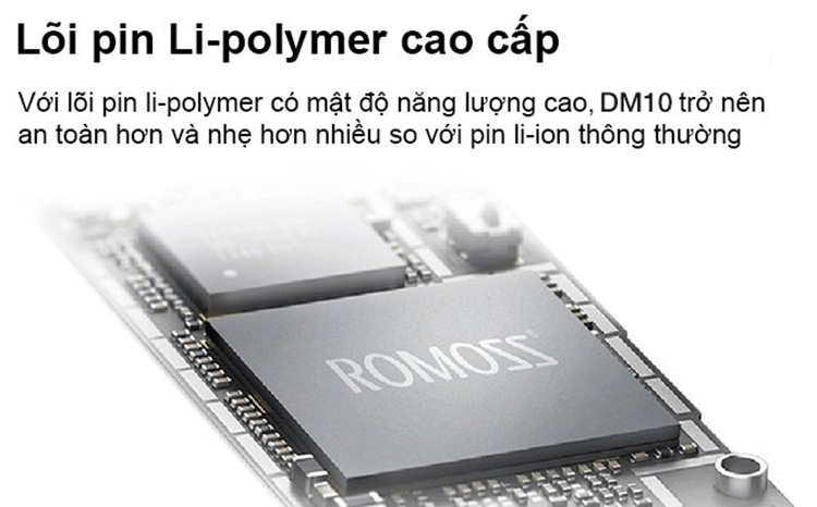 Thiết bị có dung lượng 10000mAh đủ sạc 1 lần cho tablet, một điện thoại thông minh trung bình 4 lần, giúp bạn không còn phải lo lắng về tình trạng hết pin khi đang làm việc, đi công tác,… Đặc biệt, sản phẩm sử dụng lõi pin Li-polymer với cấu tạo pin lithium polymer có mật độ cao giúp DP10 cung cấp hiệu suất sạc tốt hơn, an toàn hơn. Và được trang bị 4 đèn LED thông báo dung lượng pin giúp bạn kiểm soát dễ dàng hơn.