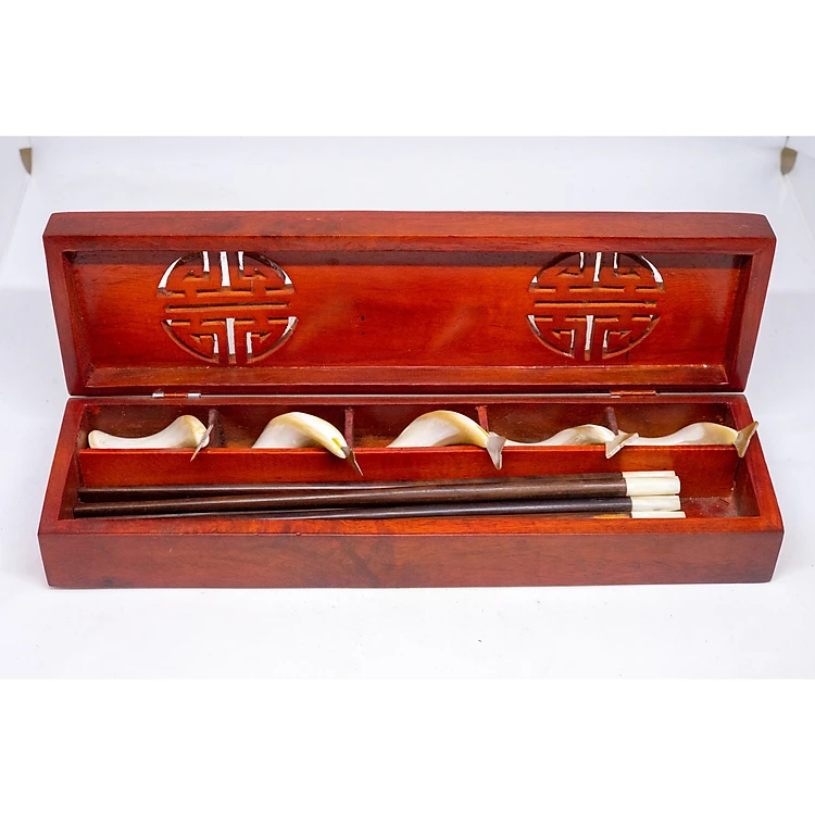 Bộ Combo gồm Hộp đựng, 10 đôi Đũa ăn và Gác đũa cao cấp làm từ gỗ trắc và xác trai