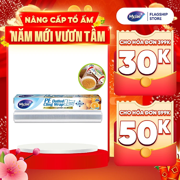 Màng bọc thực phẩm PE MyJae Đài Loan 30cmx30m dạng xé chấm đứt bảo quản thực phẩm an toàn tiện lợi