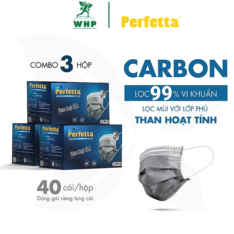 [Combo 3 HỘP - PERFETTA CARBON] - Khẩu Trang Carbon Hoạt Tính Chất Lượng Cao, Khử Mùi, Chống Bụi Mịn, Màu Xám Xanh, 4 Lớp, Bảo Vệ Tối Ưu, Đóng Gói Từng Cái - (40 cái/hộp)