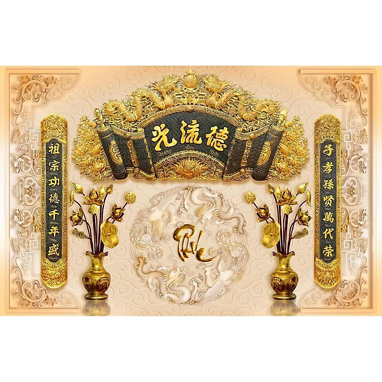 Tranh dán tường 3D phòng thờ chữ phúc - tranh cuốn thư câu đối phòng thờ- tranh trang trí phòng thờ- vải lụa