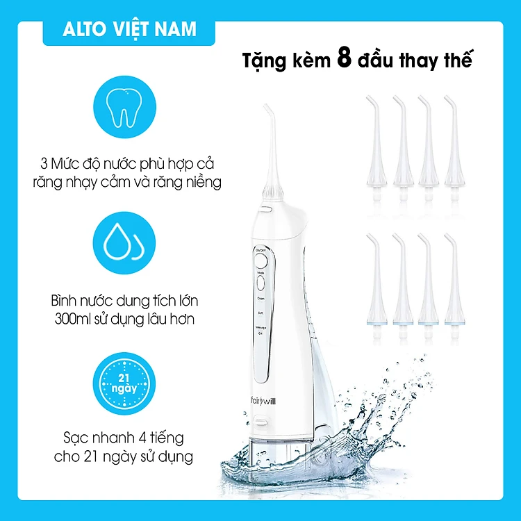 - Bình chứa nước lớn 300ml, không cần đổ thêm nước giữa chừng. Có thể thay bằng nước ấm hoặc nước súc miệng cho hiệu quả tốt hơn