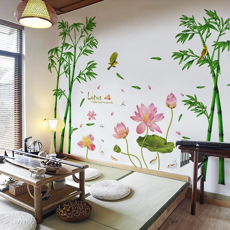 [ Size Lớn ] Decal dán tường kết hợp Hoa Sen Hồng và Bụi Tre AM9104+XL8292