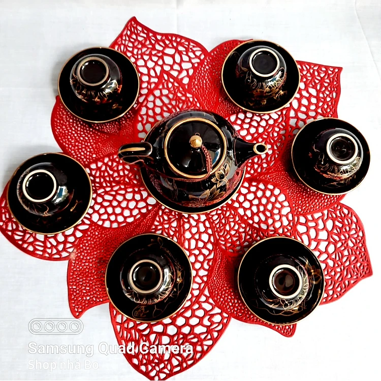 Bộ ấm trà men hỏa biến đen vẽ sen vàng 24k gốm sứ Bát Tràng cao cấp