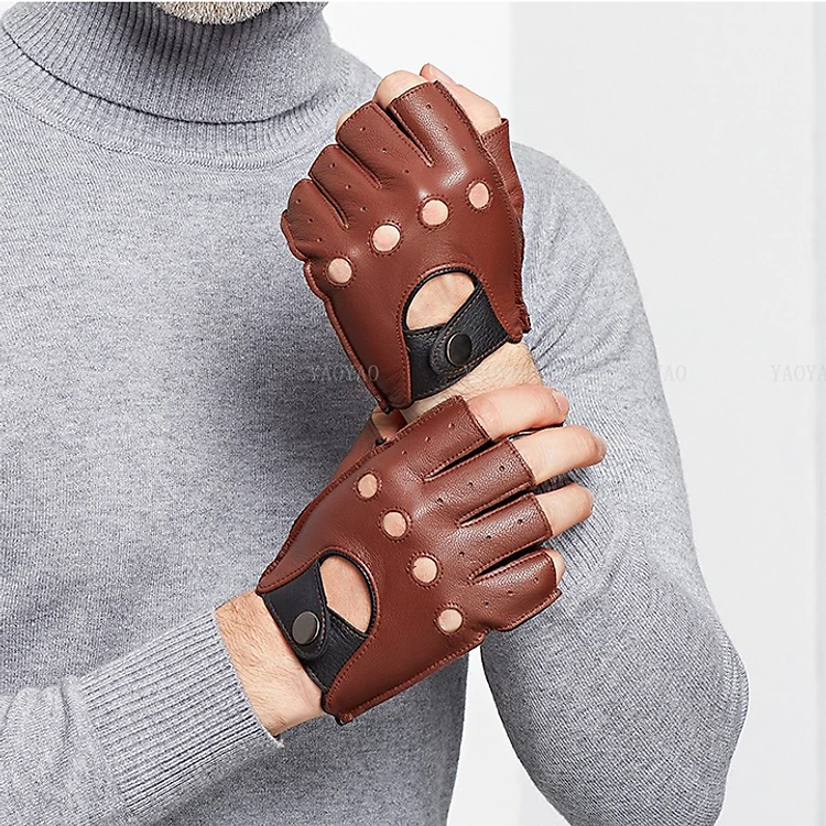 Găng tay nam hở ngón BHY8853 Màu cà phê Da cừu nguyên tấm.