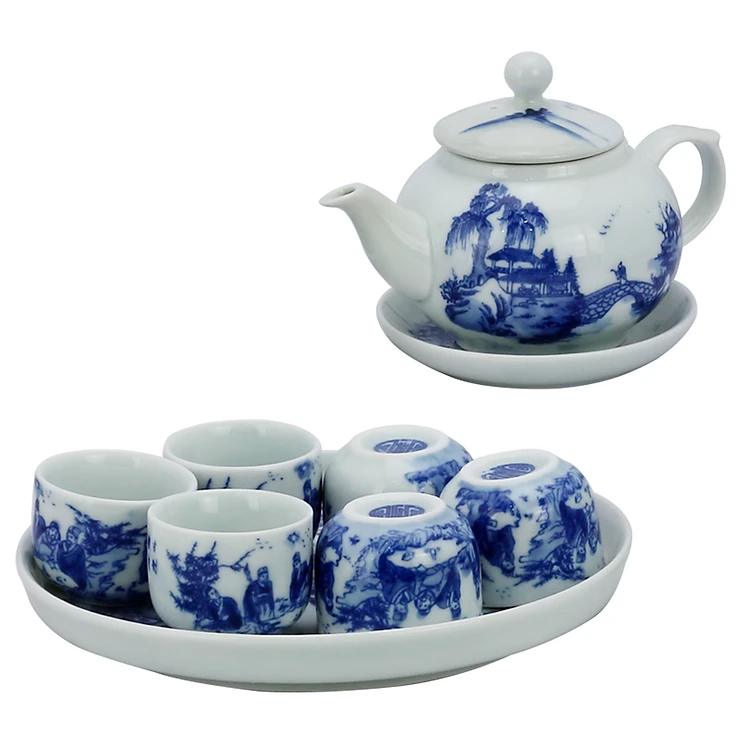 Bộ ấm chén men lam bưởi khay vẽ Phong cảnh gốm sứ Bát Tràng (bộ bình uống trà, bộ bình trà)