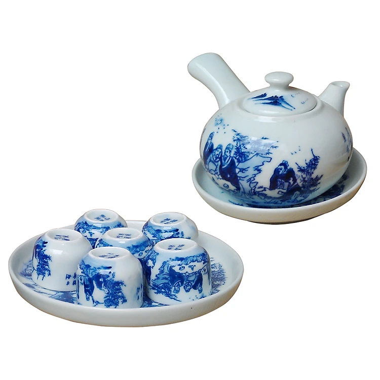 Bộ ấm chén men lam quai ngang Trúc Lâm Thất Hiền gốm sứ Bát Tràng (bộ bình uống trà, bộ bình trà)