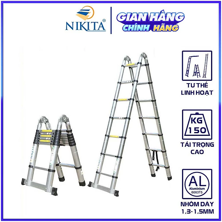 Thang nhôm rút đôi, có bánh xe di chuyển tiện lợi, thanh giằn khóa và thân thang an toàn, chiều cao từ 3,8m - 8m