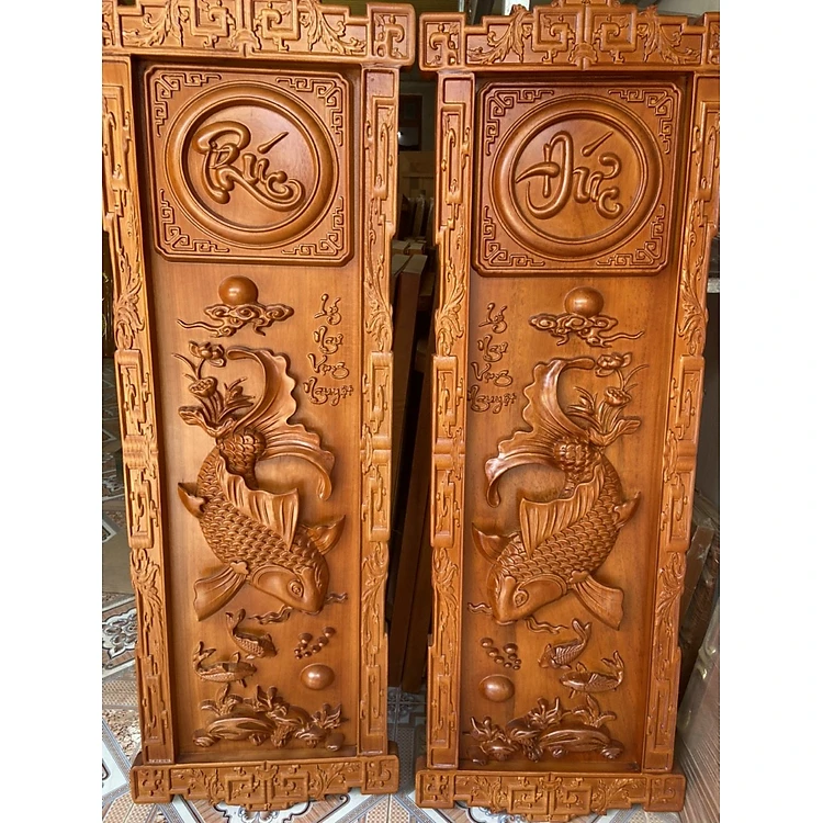 Tranh treo tường lý ngư vọng nguyệt bằng gỗ gõ đỏ kt 37×117×4cm