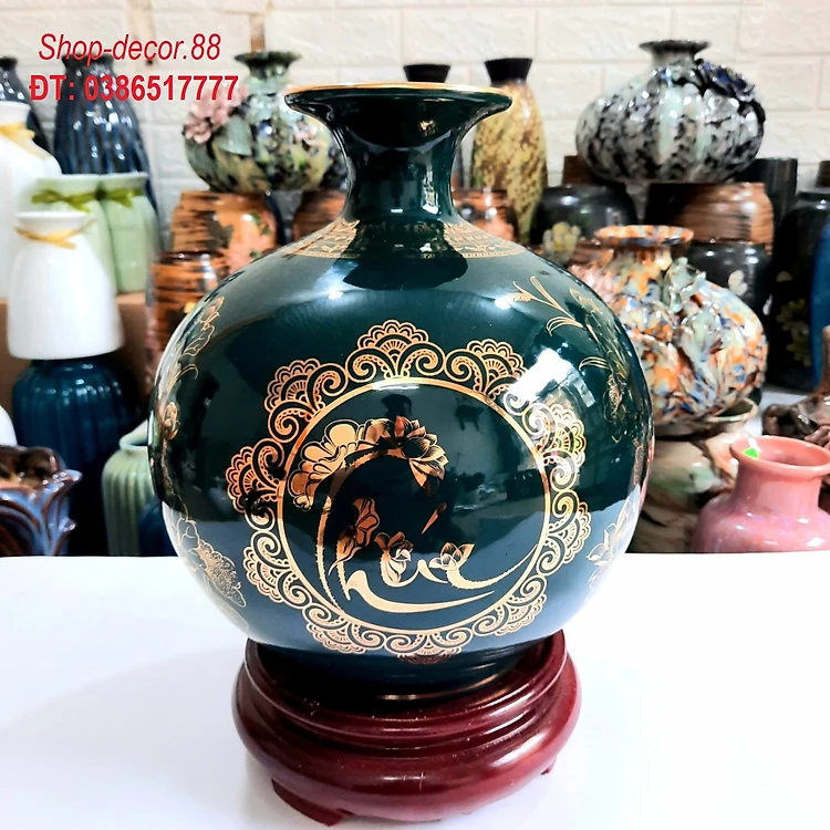 Bình hút tài lộc phong thủy Phúc - Lộc - Thọ vẽ vàng 24k, gốm sứ Bát Tràng cao cấp (H26xD24cm)