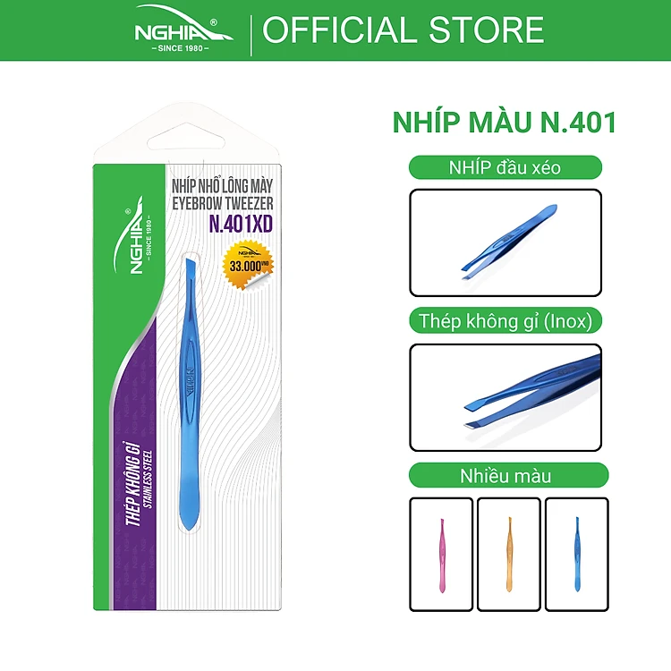 Nhíp Inox Đầu Xéo Vỉ Giấy Màu Xanh Dương KỀM NGHĨA N.401XD