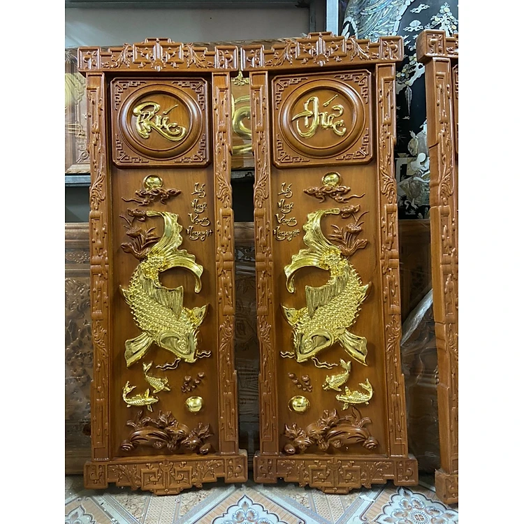 CẶP TRANH LÝ NGƯ VỌNG NGUYỆT KHẮC CHỮ PHÚC ĐỨC BẰNG GỖ GÕ ĐỎ KT 37×117×4CM